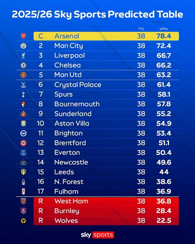 天空预测英超排名:阿森纳夺冠,曼城第二利物浦第三曼联第五